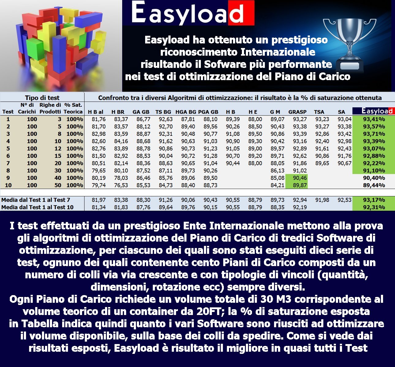 Easyload è risultato il migliore in quasi tutti i Test di ottimizzazione del Piano di Carico, effettuati da un prestigioso Ente Internazionale. Guarda la tabella coi risultati.